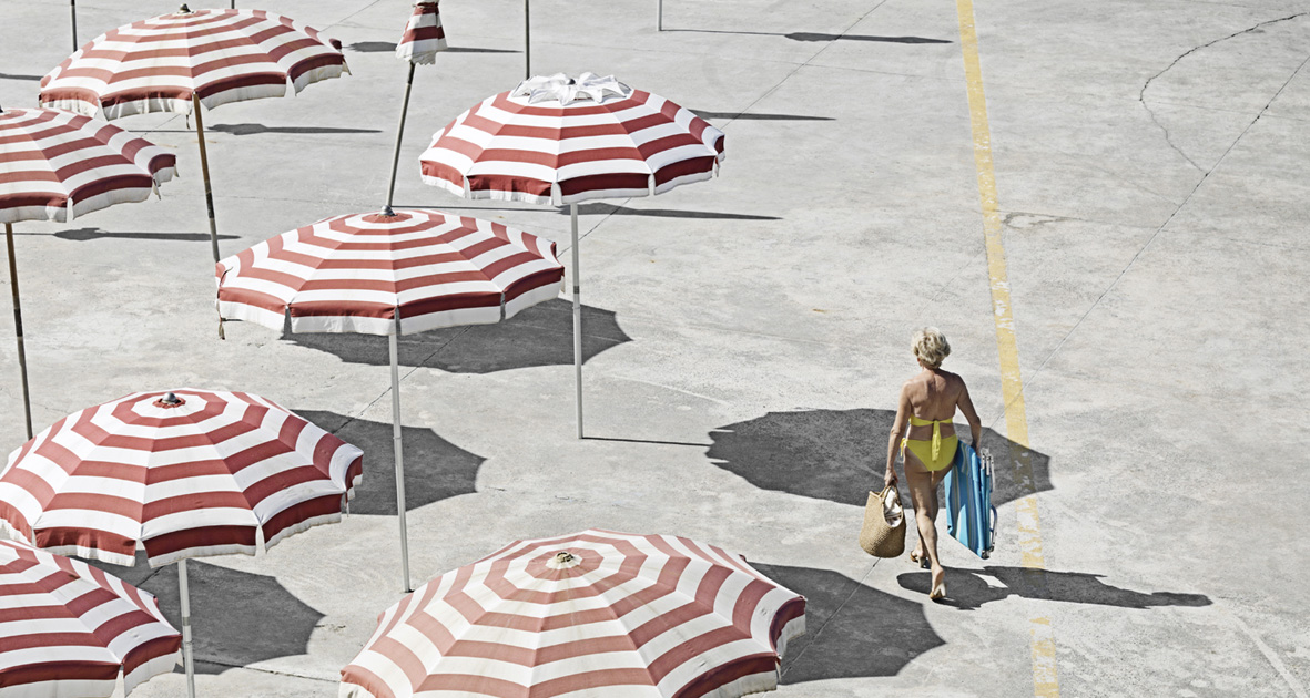 Entweder man ist Mitglied im Club, oder nicht, dann ist man entweder ausgesperrt oder zahlt eine empfindlich hohe Tagesgebühr für die Liegestuhl- und Duschenbenutzung. Schirme, Liegen, Zäune, Strandhäuschen formen ein mal strenger mal freier geordnetes geometrisches Muster, ganz im Gegensatz zu den wenigen freien Stränden oder Zugängen zum Meer - hier herrscht Anarchie und Freiheit.