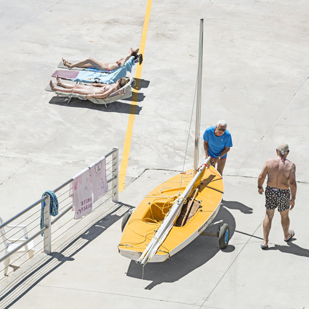 An der vorherrschenden Hautfarbe erkennen wir den Zustand der Sommersaison, je später im Jahr desto gebräunter die Hauttöne. Auch die Lichttemperatur verändert sich vom Frühjahr über den Sommer bis zum Herbst spür- und sichtbar. Nichts auf diesen Bildern deutet auf Hektik hin, alles ist Ruhe und Gelassenheit, Die Badenden kennen sich untereinander, sind zusammen älter geworden. Jedes Jahr der gleiche Rhythmus … im Frühsommer kommen die Liegen und Schirme raus und am Ende der Saison wird alles in die mit einfachsten Mitteln gebauten Garagen und Schuppen geräumt, vor den Herbst- und Winterstürmen geschützt, die sich auf den letzten Bildern schon andeuten.
